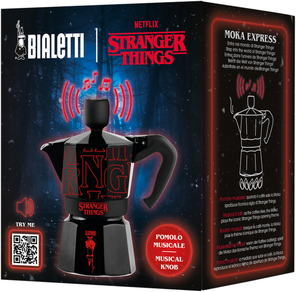 The espresso pot in the cool "Stranger Things" design can do even more: the loudspeaker integrated in the knob of the lid plays the Stranger Things song during the brewing process. An absolute must-have for all fans of the cult series and, of course, makes for a wonderful gift.