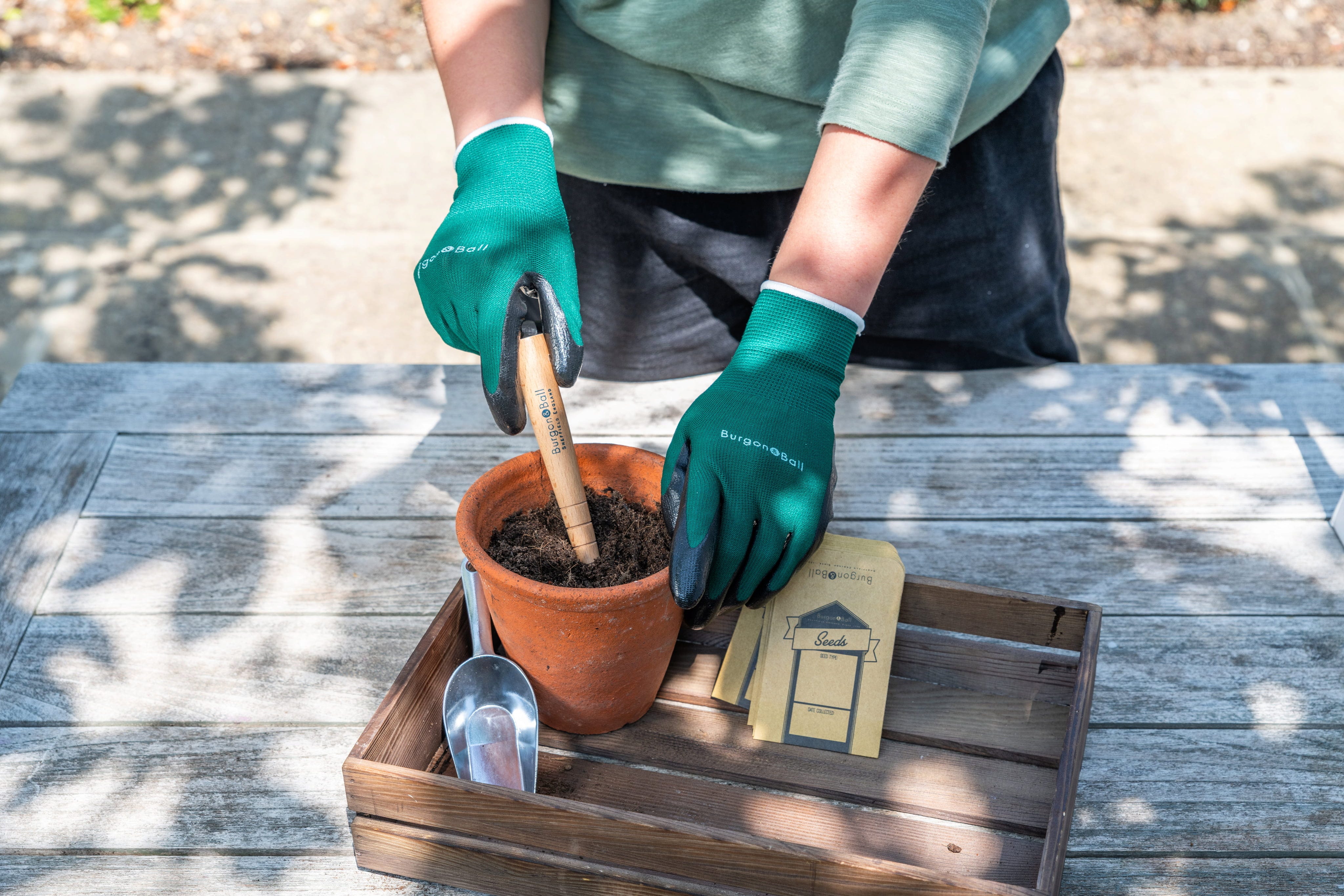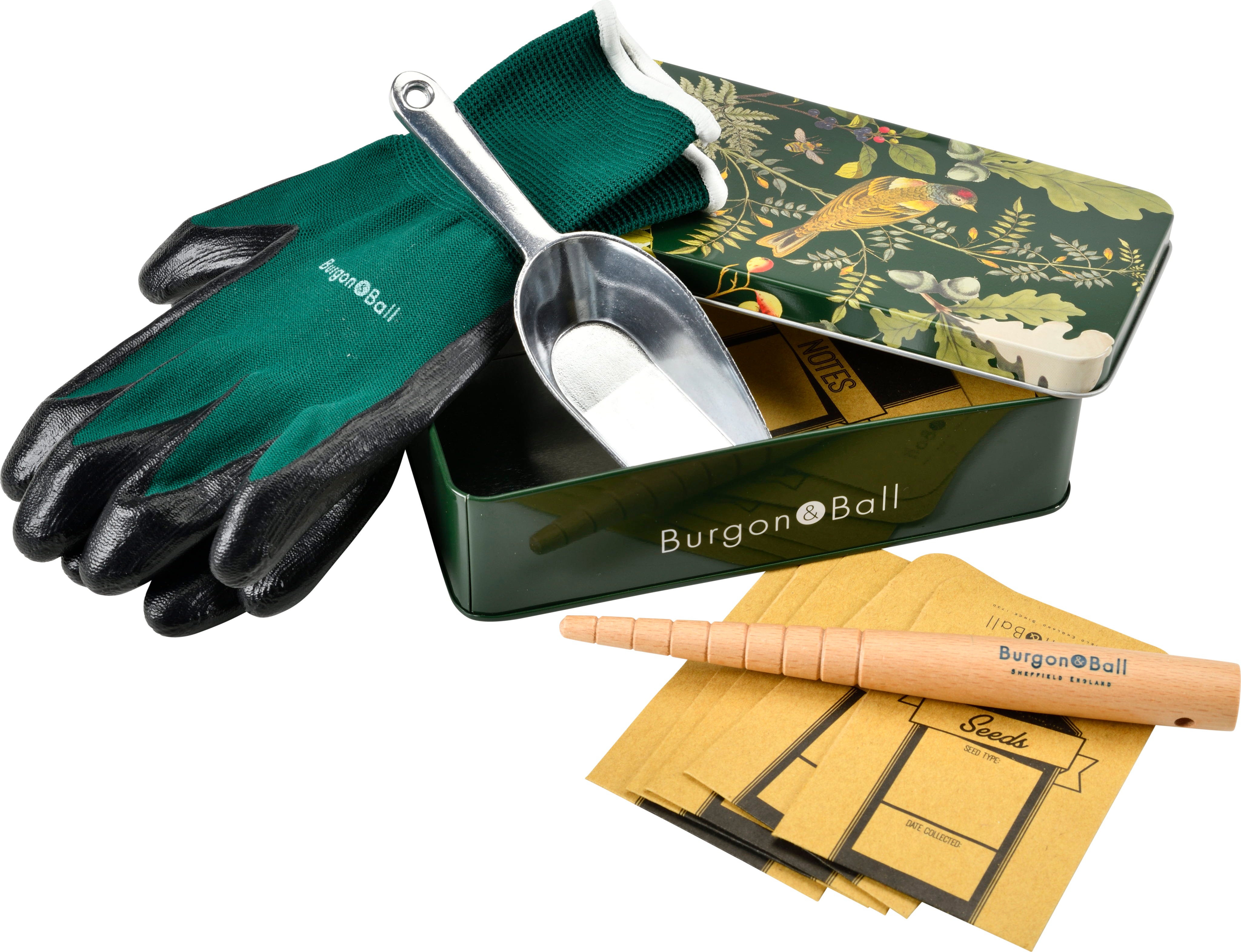 Kickstart your gardening season perfectly with this thoughtfully curated Seed Sowing Set from Burgon & Ball! Inside the beautifully decorated metal tin, you will find everything you need to start growing your botanical treasures: a precision aluminium seed scoop, a wooden dibber for larger seeds, and robust paper seed envelopes. Matching stretch gloves with a protective nitrile coating complete the package.