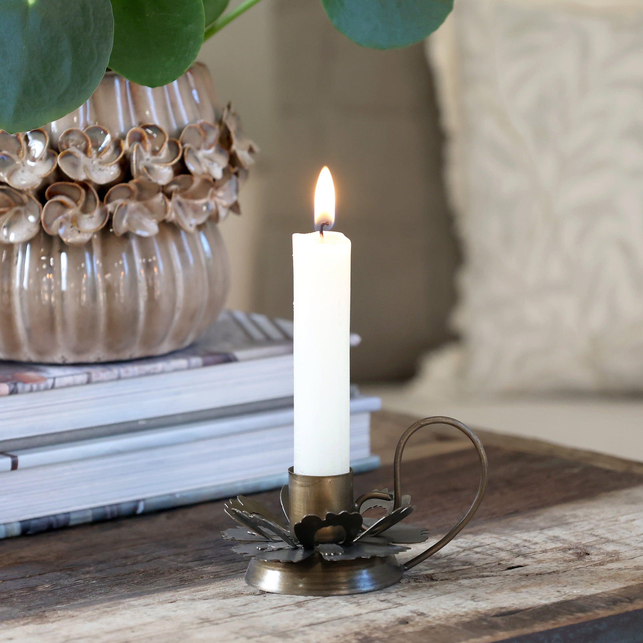 This petite chamber candlestick brings an elegant highlight to any room. Perfectly proportioned for mini taper candles, it creates atmospheric lighting and adds a sophisticated touch of vintage charm to your home.