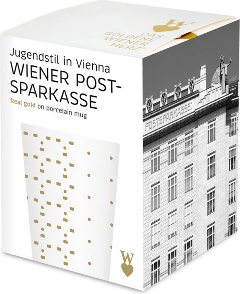 Inspired by the Art Nouveau buildings of Vienna, this porcelain mug is decorated with a detail of the Wiener Post-Sparkasse, the savings bank of the Vienna Post Office.