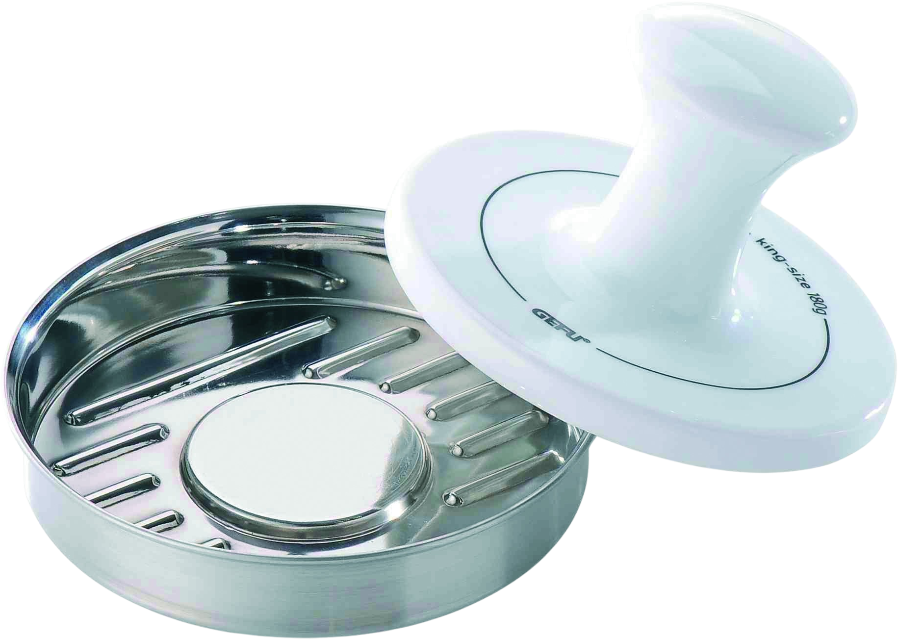 Thanks to the clever curvature of the dish, your pattyacquires its appetising contours, and the integrated ridges create grooves that not only look appealing but also shorten the cooking time, ensuring rapid, full-flavoured results! Whether you are shaping the classic 120 g size patty or a super-size 180 g one, this press guarantees uniform cooking results. Furthermore, premium stainless steel and porcelain are long-lasting and easy to clean in the dishwasher.