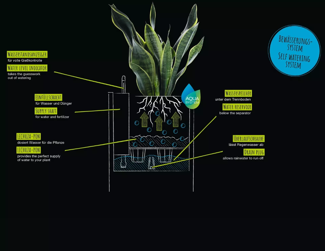 - The integrated original LECHUZA irrigation system provides plants with optimal water supply.