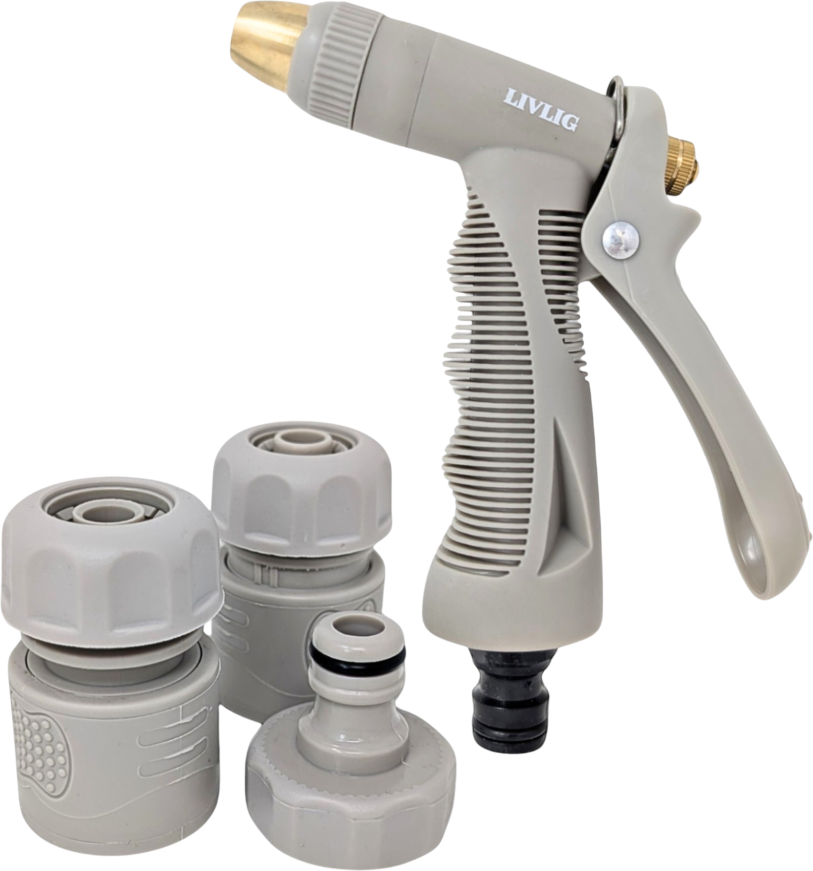 - 4-piece watering set consisting of spray nozzle, tap connection (G3/4 inch), quick coupling piece (1/2 inch) and water stop adapter (1/2 inch)