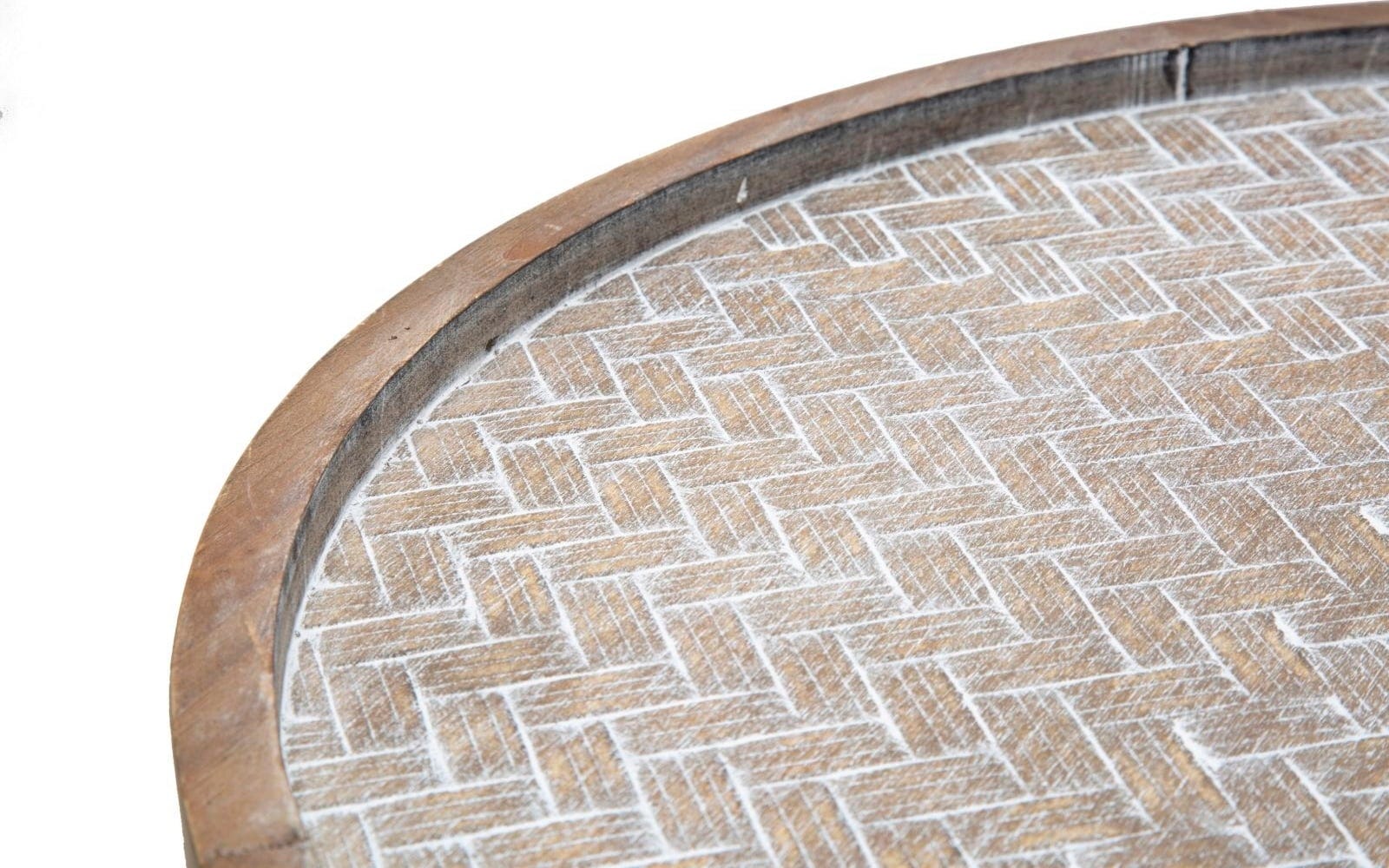 The table has 2 round shelves: The tops are made of wood and have a modern wicker look that adds a warm, natural accent. The lower shelf serves as a practical compartment for magazines or remote controls.