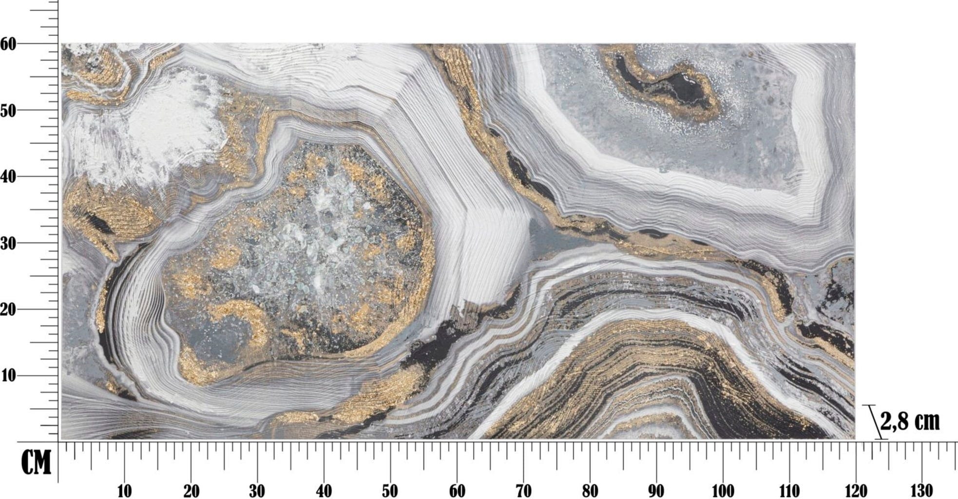 The design impresses with a striking geological structure reminiscent of the interior of a precious geode or a mysterious cave. Interlocking layers of elegant gray, anthracite, and cream white form a complex relief brought to life by magnificent golden veins and glittering inclusions. Stretched on a high-quality wooden frame, this piece is a true eye-catcher that stylishly blurs the boundaries between nature and modern art.