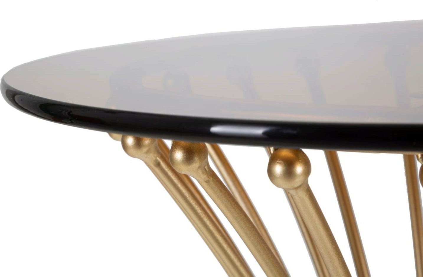 The frame is formed from numerous vertical metal struts that taper elegantly in the middle and are decorated with small, shiny spheres at the ends. The design is crowned by a tabletop made of high-quality smoked glass, which gives the object a modern depth and harmonises perfectly with the warm gold tone. Whether as an extravagant side table or a central eye-catcher – the Centur brings pure glamour to your home.