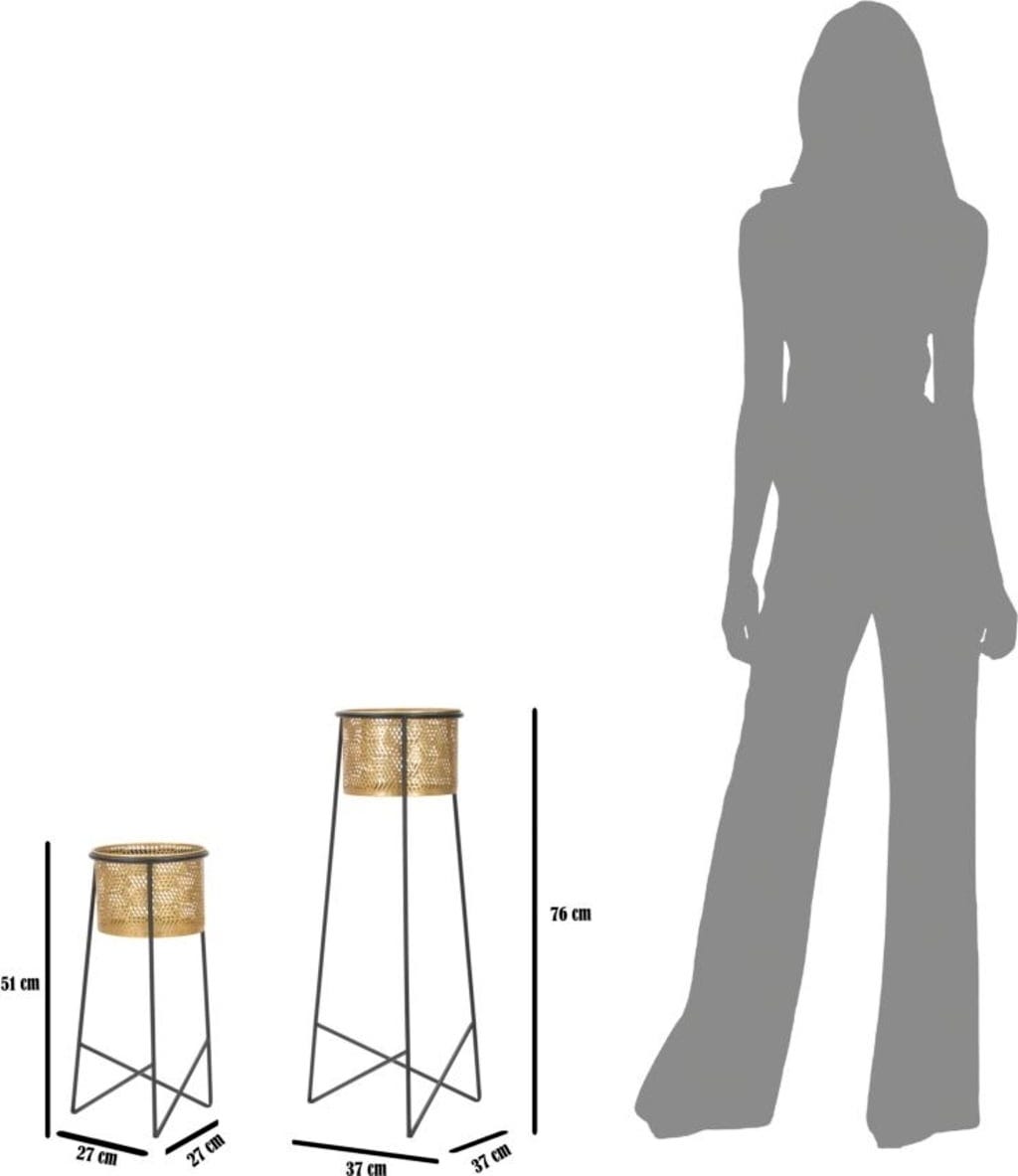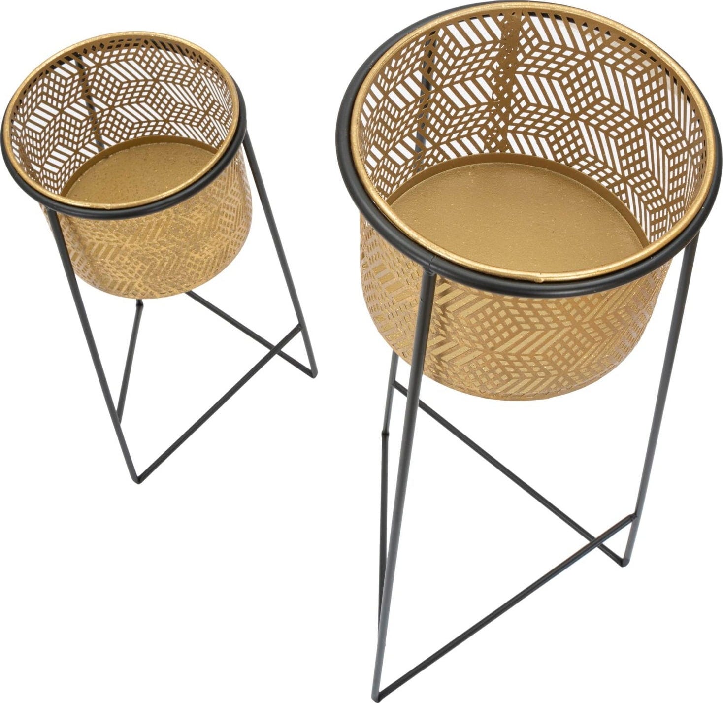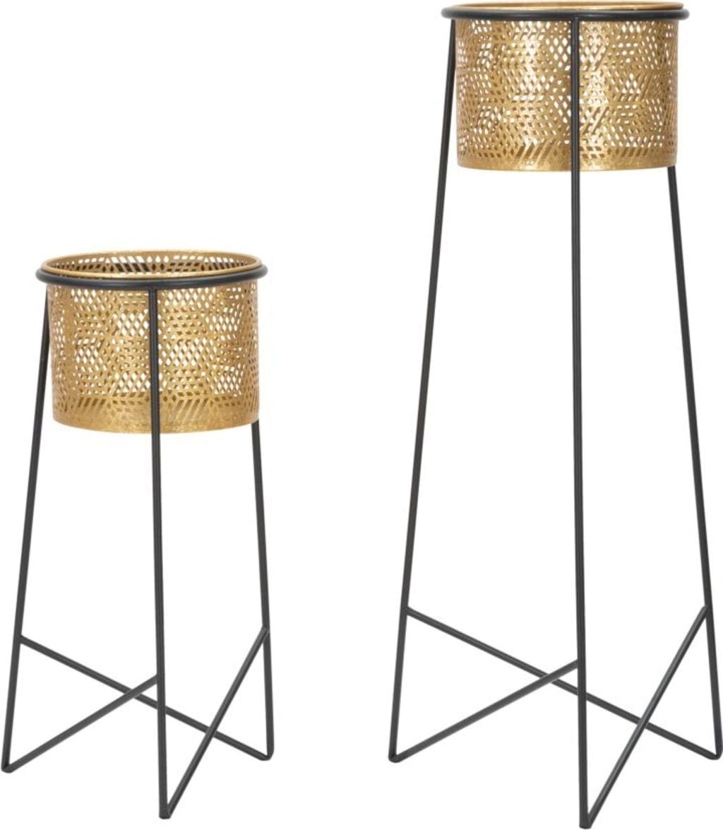 The cylindrical planters sit atop slender, black metal frames and are decorated with a special geometric perforation in a gold look, which gives the set a touch of class. The pot holders are removable, making planting and caring for your plants particularly easy. Whether arranged as a duo or placed individually in the room – the Exy set is the perfect choice for setting stylish accents in any ambiance!