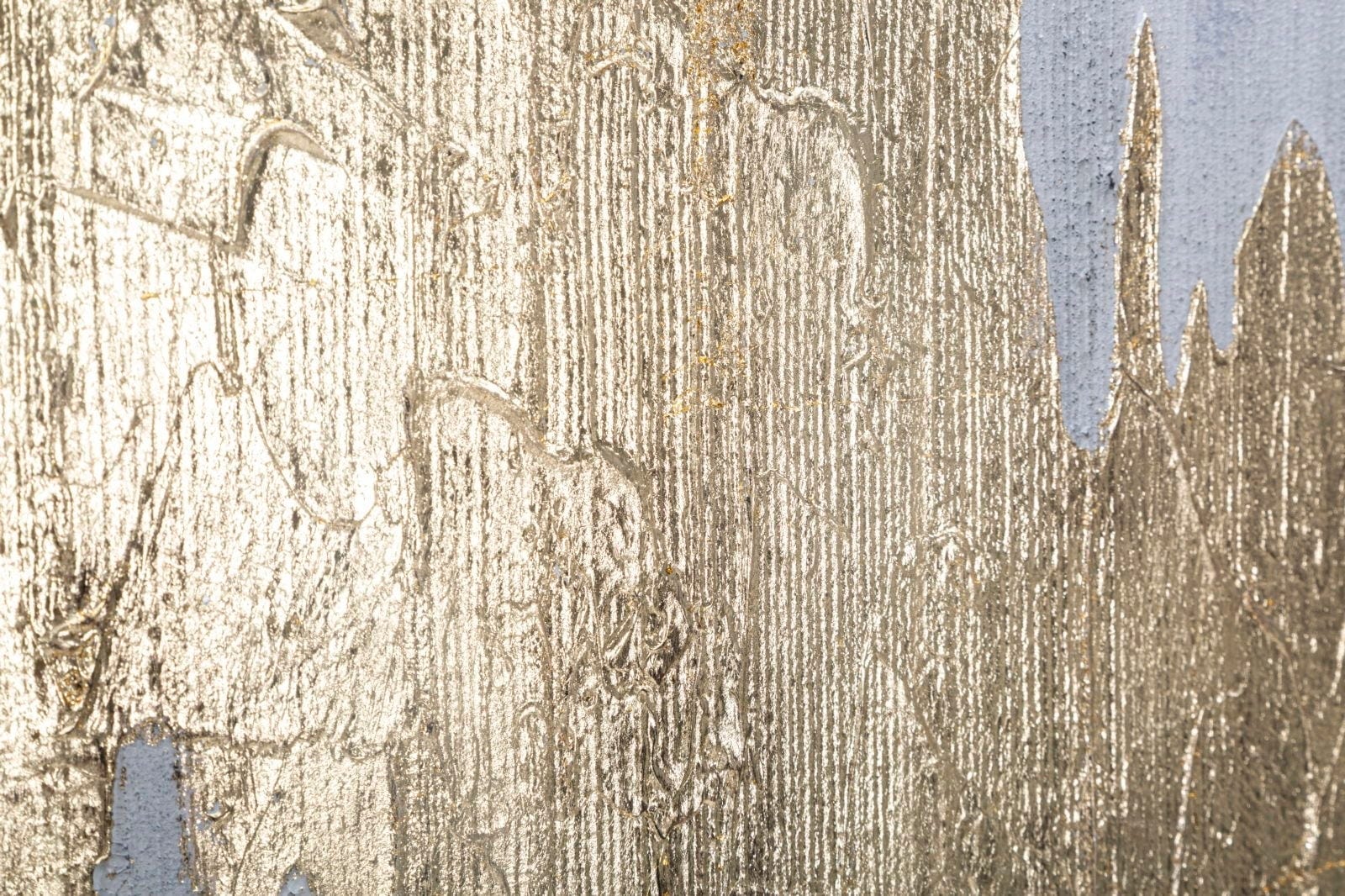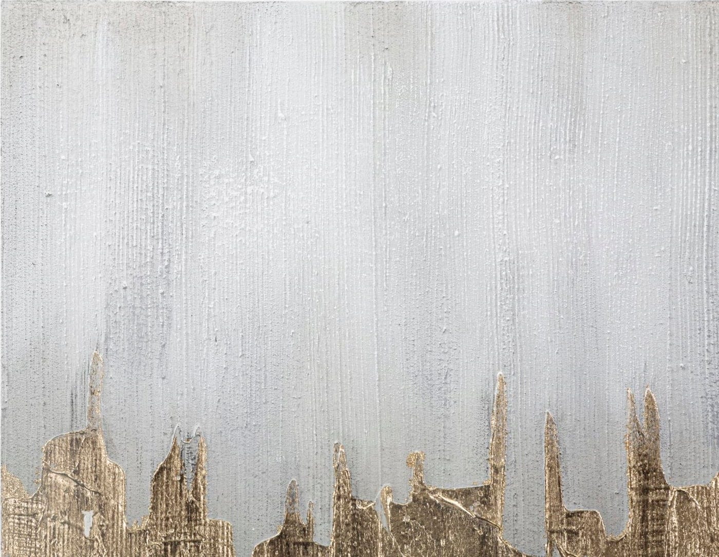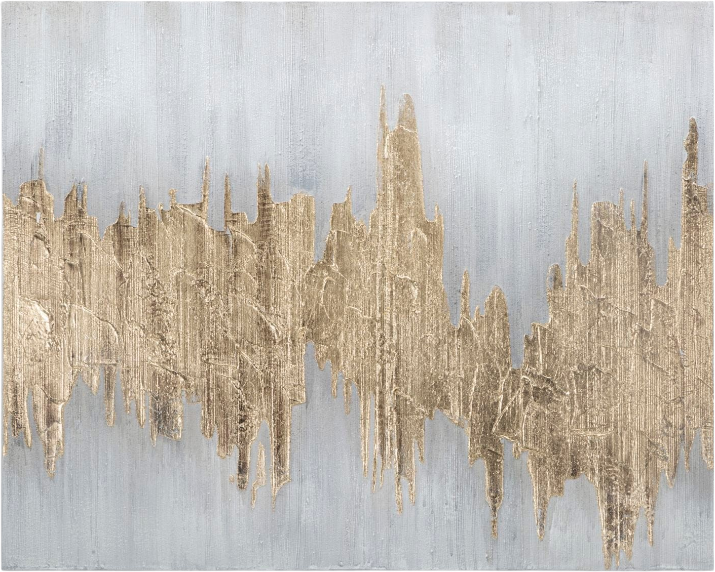 The design impresses with a powerful, horizontal formation in shiny gold that stretches across the canvas like a sculptural mountain range or a flowing metal structure. The background in elegant silver provides a cool, modern contrast and enhances the visual depth of the image. Thanks to the coarse, vertical brushstrokes and the haptic texture, the artwork appears particularly vibrant. Stretched on a high-quality wooden frame, Goldage brings exclusive gallery glamour directly into your home.