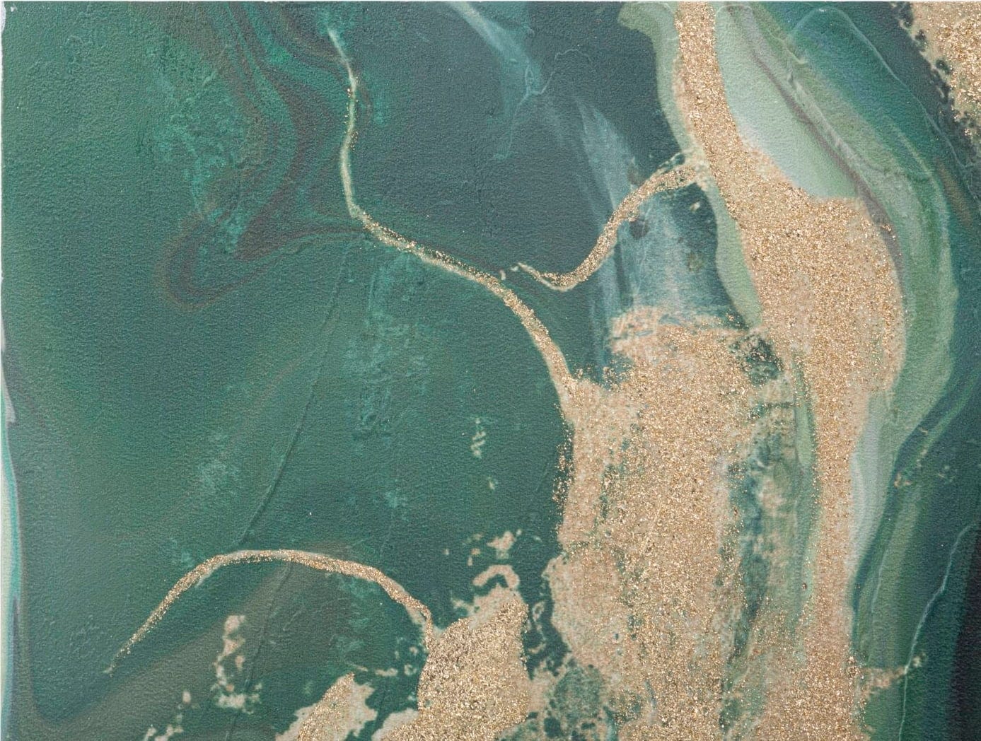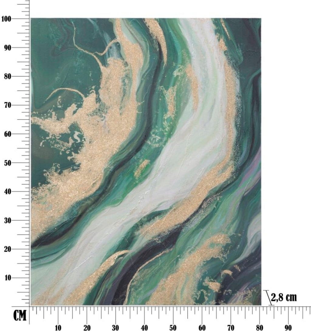 The composition fascinates with deep green and emerald color swirls that contrast harmoniously with light, almost white accents. A special highlight is the generously incorporated, glittering gold elements that run like precious veins through the flowing structure and create brilliant effects when exposed to light. Stretched on a high-quality wooden frame, Greenery is a touch of modern art that brings freshness and exclusivity directly into your home.