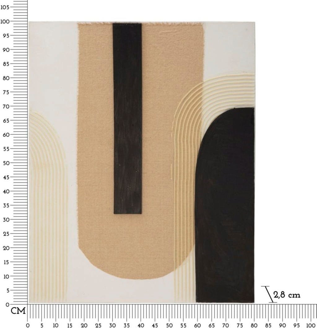 The artwork combines large-scale, black geometry with warm beige tones on a light canvas. A special visual and tactile highlight are the relief-like applications that run in precise arcs, as well as the deliberately frayed edges of the fabric elements. Stretched on a sturdy wooden frame, this wall art offers a unique blend of architectural rigour and natural texture.