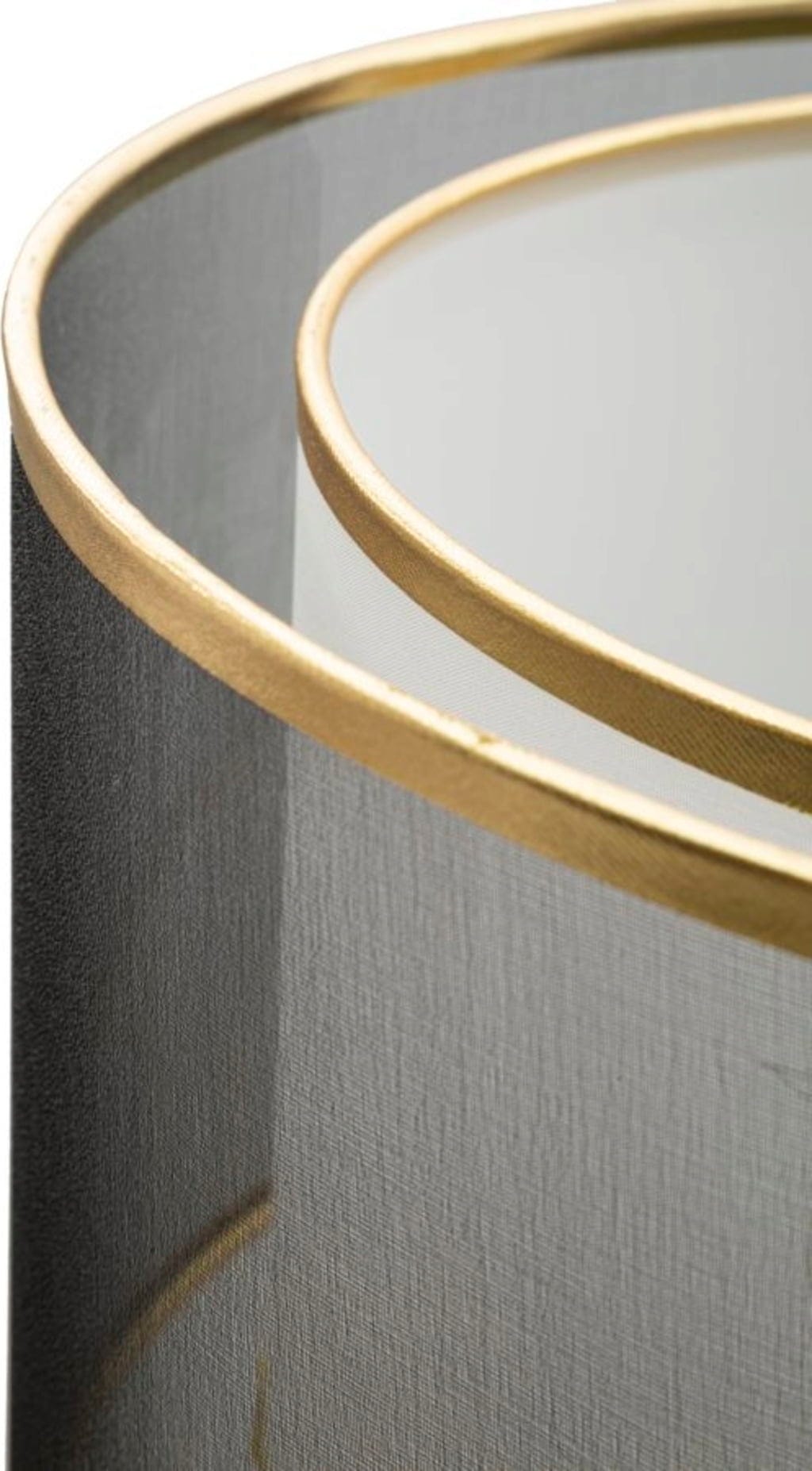 The design centrepiece is the two-tier fabric lampshade: an inner, white shade is enveloped by an outer layer of transparent grey fabric. The elegant gold edges on both layers harmonise perfectly with the slender, two-tone frame and give the lamp a luxurious touch. Thanks to this innovative shade construction, the light is gently filtered and provides multi-dimensional, warm lighting in your living or sleeping area.