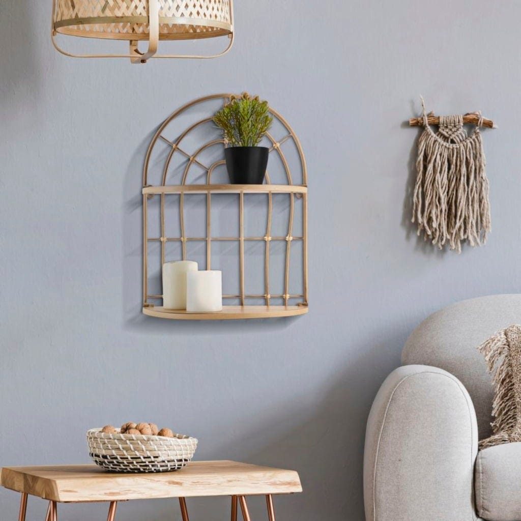 The gently curved arches and the warm rattan aesthetic create a calm atmosphere, while the two semi-circular shelves offer exactly the space you need for your favorite decorative treasures, small plants, or personal mementos.