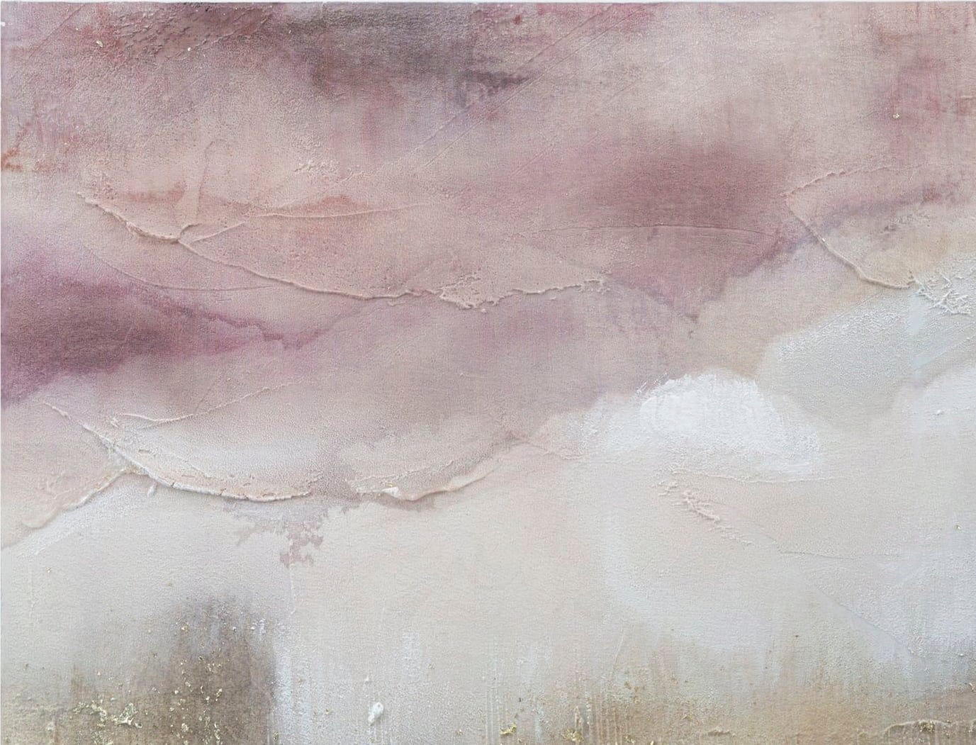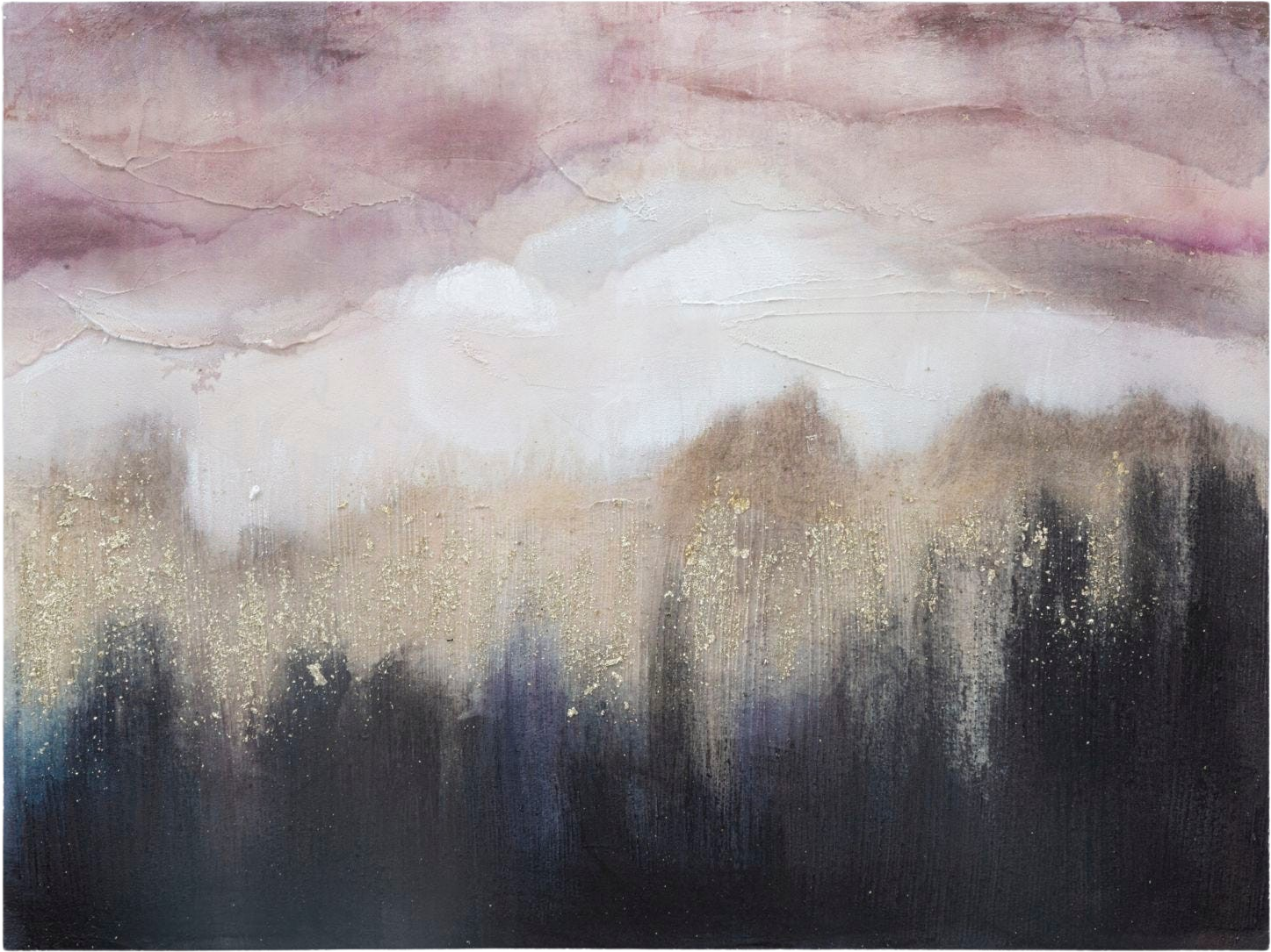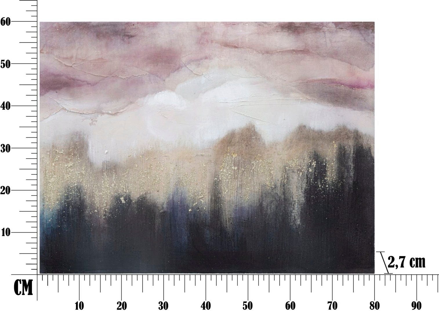 The work fascinates with the harmonious interplay of soft pink tones in the sky, misty white cloud formations, and dark, mystical mountains in the lower area. Elegant gold accents in the center of the image provide a luxurious texture and capture the light in a subtle way. Stretched on a high-quality wooden frame, this artwork brings a touch of modern abstraction and character directly into your living room or bedroom.