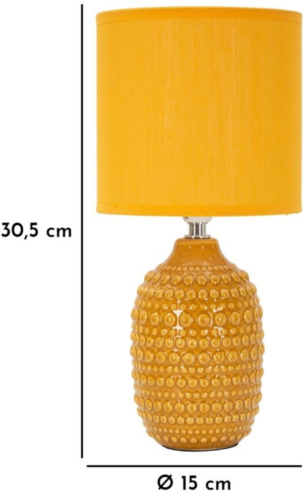 Give your bedroom a modern touch of colour and noticeable elegance. This bedside lamp in bright ochre is the ideal accessory to stylishly enhance your relaxation area. The base stands out with its warm colour and unique, modern relief decoration of raised dots - a tactile design that immediately catches the eye.