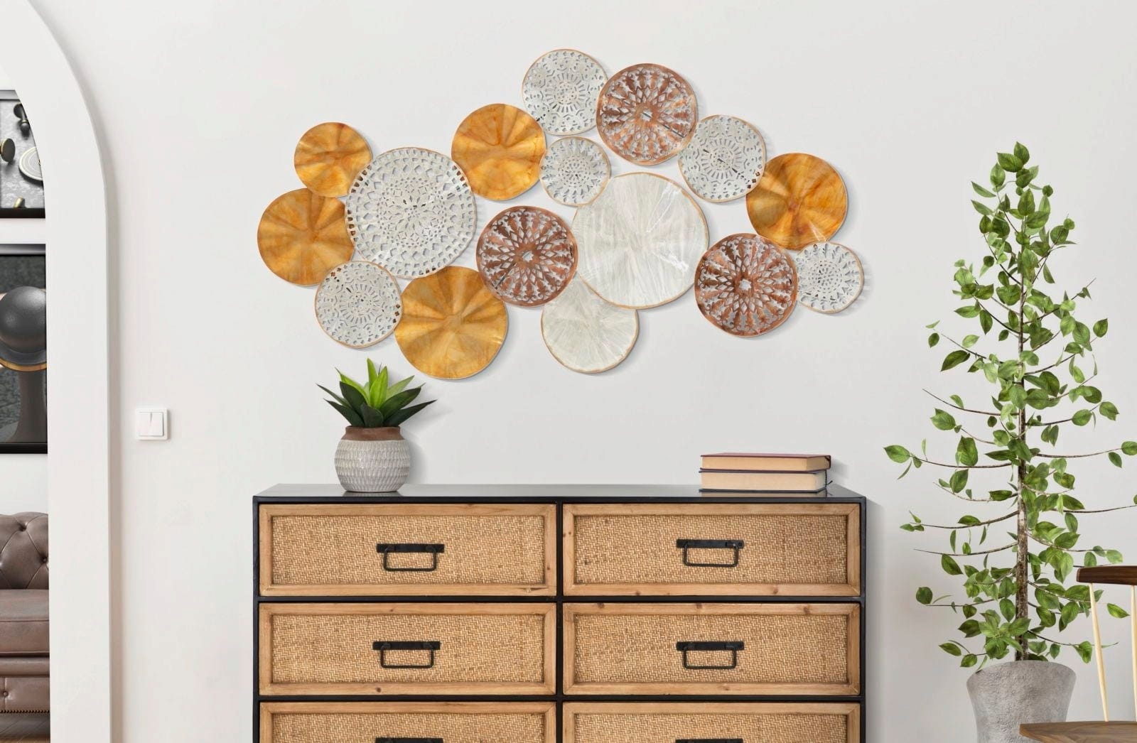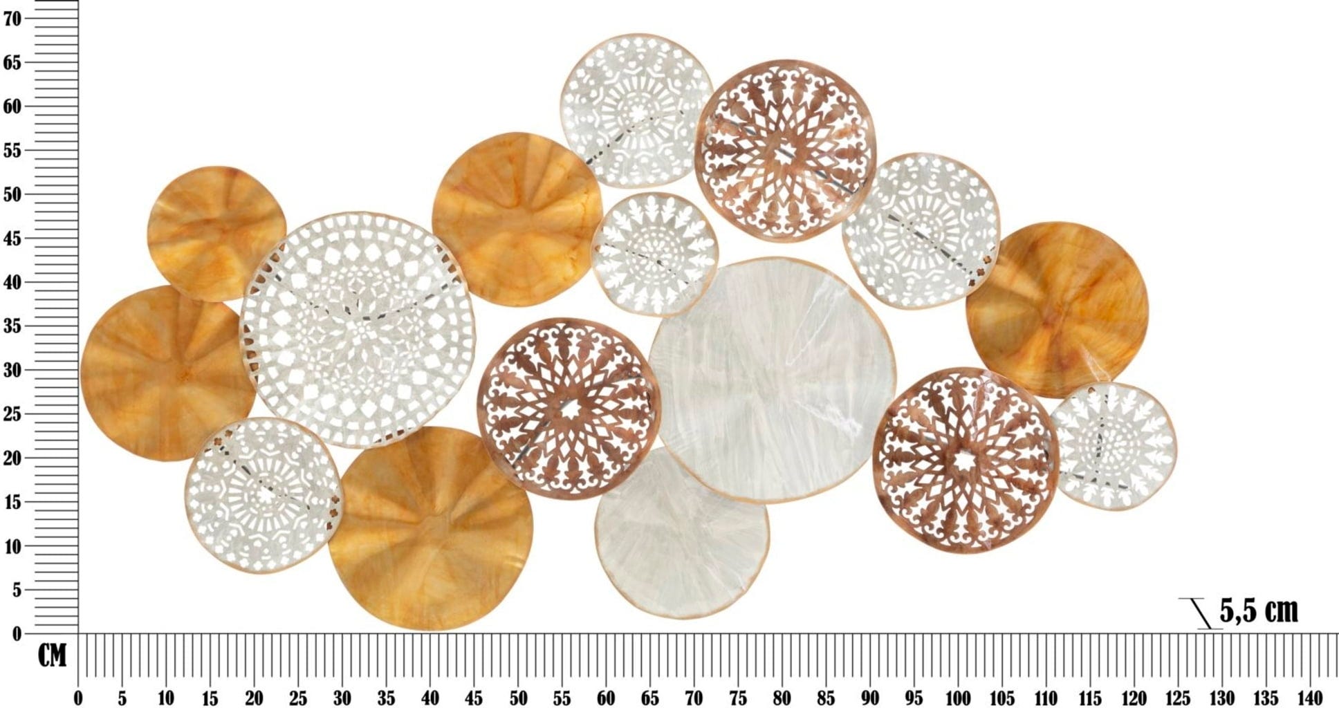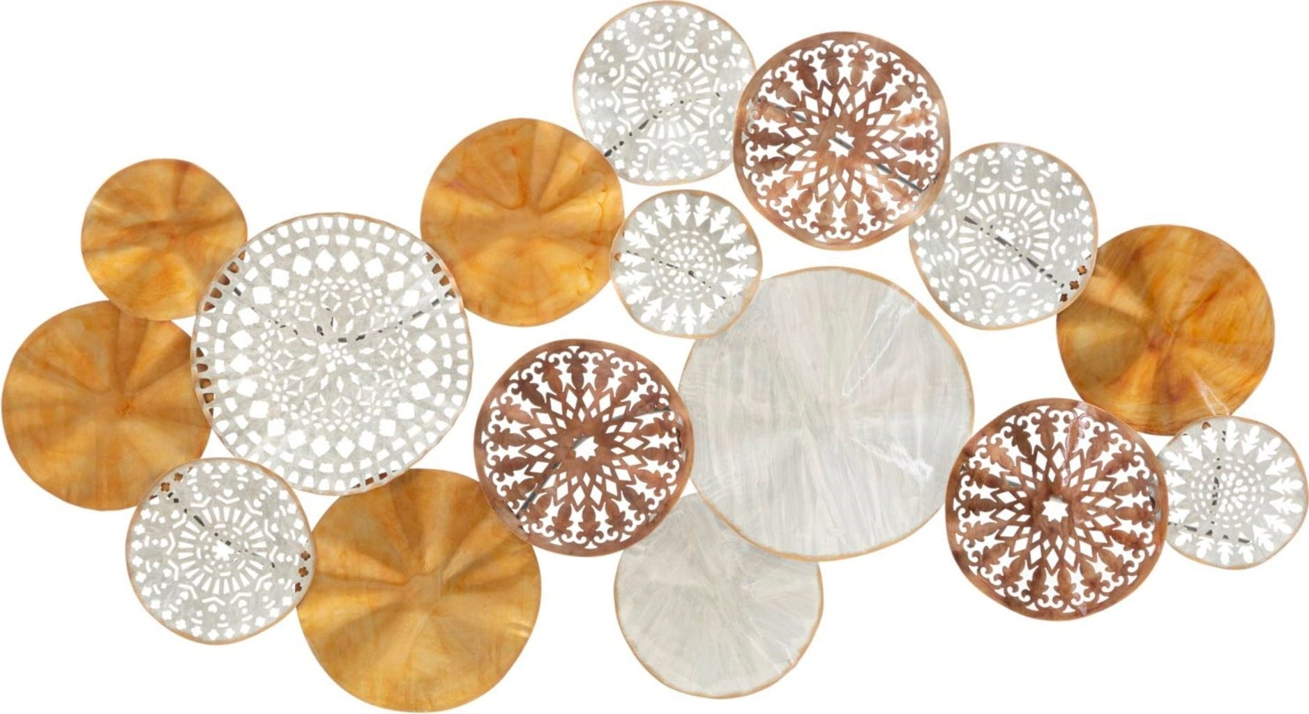 Make an impressive statement with the Triby wall decoration by Mauro Ferretti. This decorative 3D wall panel is a masterpiece of symmetry and texture that transforms your walls into a modern art gallery. The composition consists of a variety of circular figures that shine in a harmonious interplay of warm gold and ochre tones as well as cool white and silver.