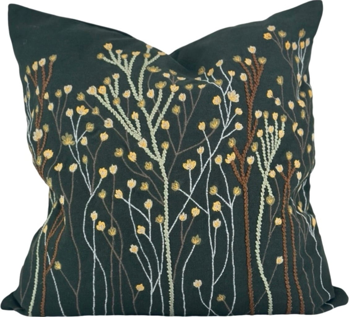 The “Paniculata Moss” cushion cover brings a natural, calming atmosphere to your home. The deep green cotton fabric is beautifully complemented by delicate embroidered flower buds in warm earthy tones – a true eye-catcher on any sofa or bed.