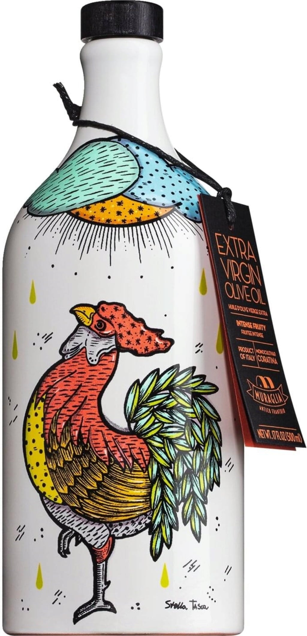 At Muraglia, cold-pressed Coratina olives from Apulia are transformed into an intensely fruity olive oil. The non-GMO olives are carefully harvested by hand and then cold-pressed in a stone mill before being filled into handmade clay bottles. The olive oil is ideal as a seasoning oil for raw vegetables, pasta and soups. The artwork adorning this bottle is by artist Stella Tasca.