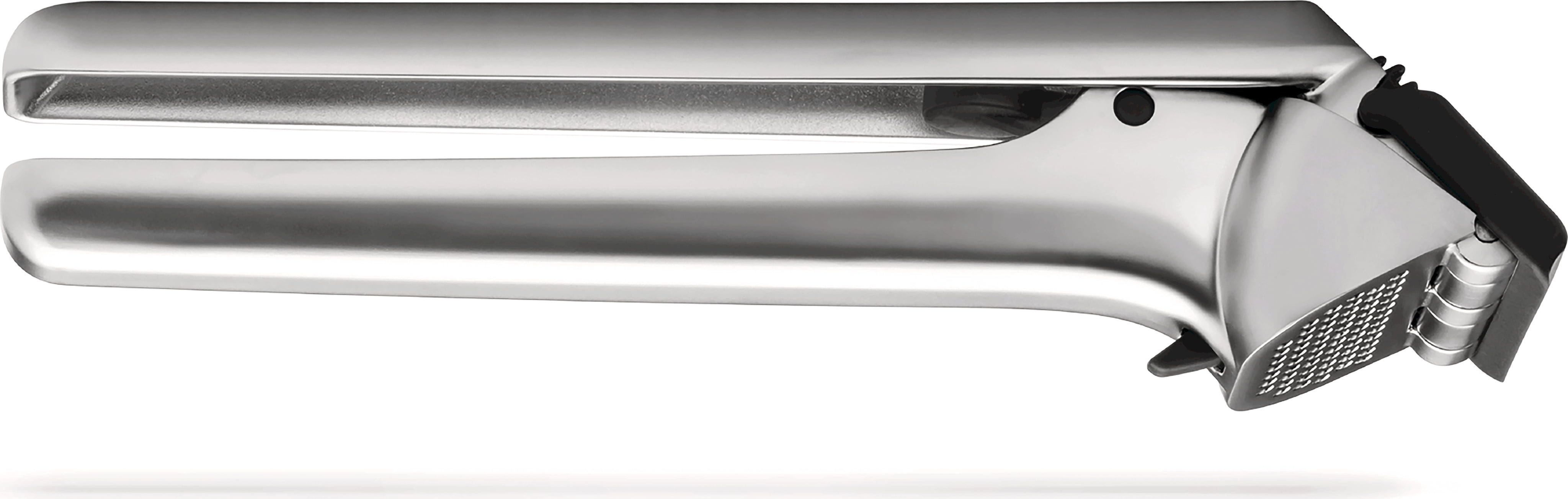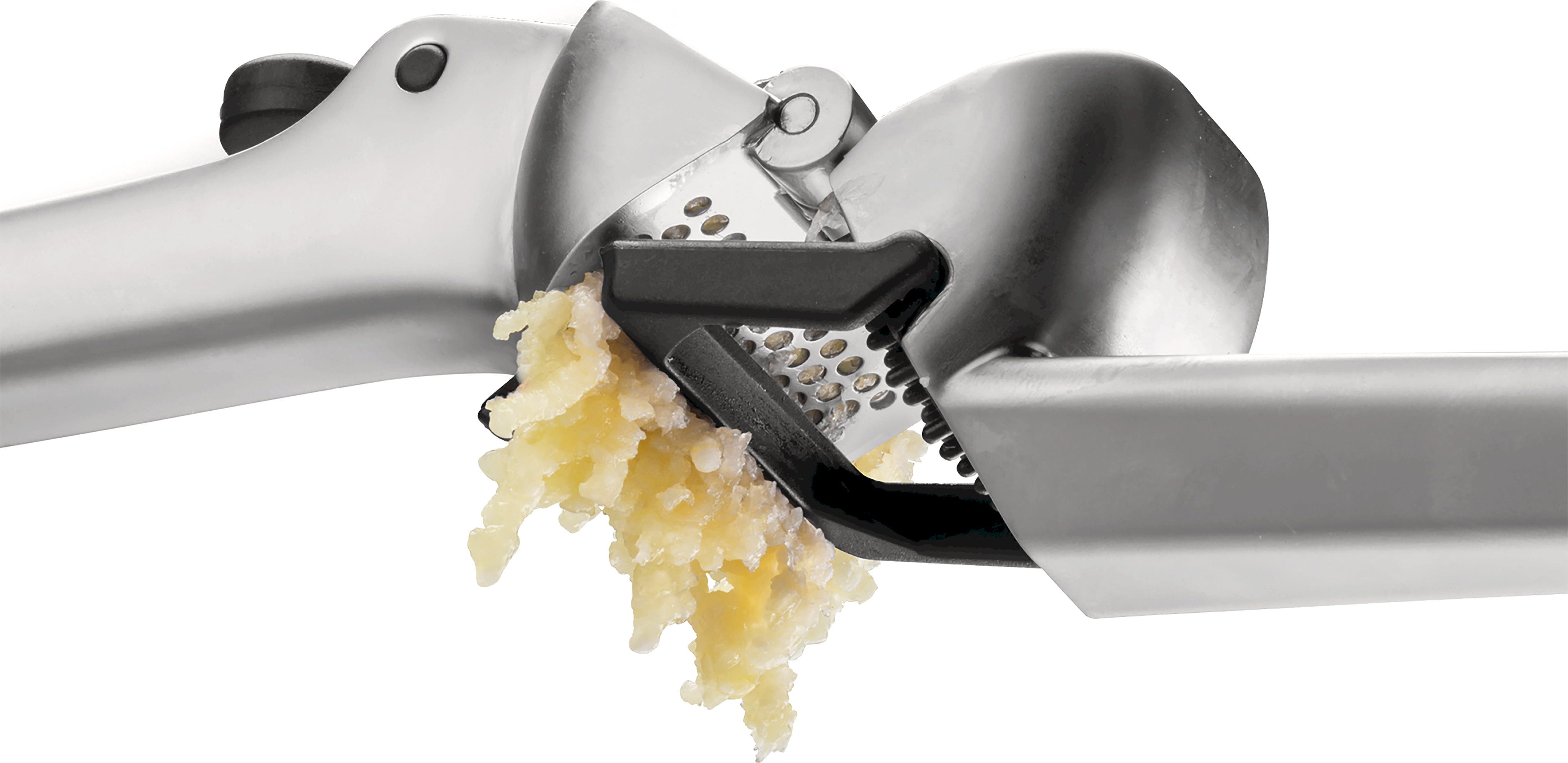 As you open the handles, an integrated scraper automatically clears any residue from the surface, while the "Peel Eject" button conveniently shoots out the empty skins. This keeps your hands garlic-free and ensures the press is ready to go again after a simple rinse.