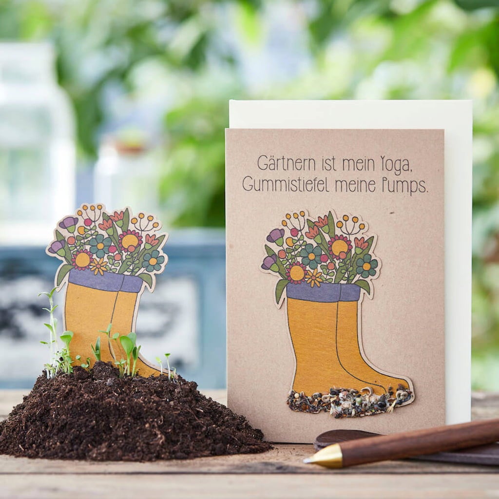 This lovingly designed card is the perfect gift for those who love to spend time in the garden. With an extra surprise - the rubber boots (seed paper) can be removed and planted in the soil. After a few days, the seeds will sprout and grow into gorgeous wildflowers.