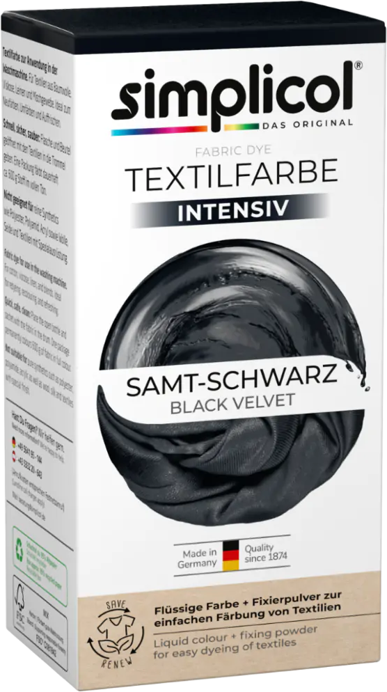 Dyeing, recolouring or refreshing textiles is easy with simplicol 's Textile Dyes INTENSIVE. The liquid dye is placed into the drum of the washing machine, allowing the colour to spread evenly. The result: brilliant, bright colours!