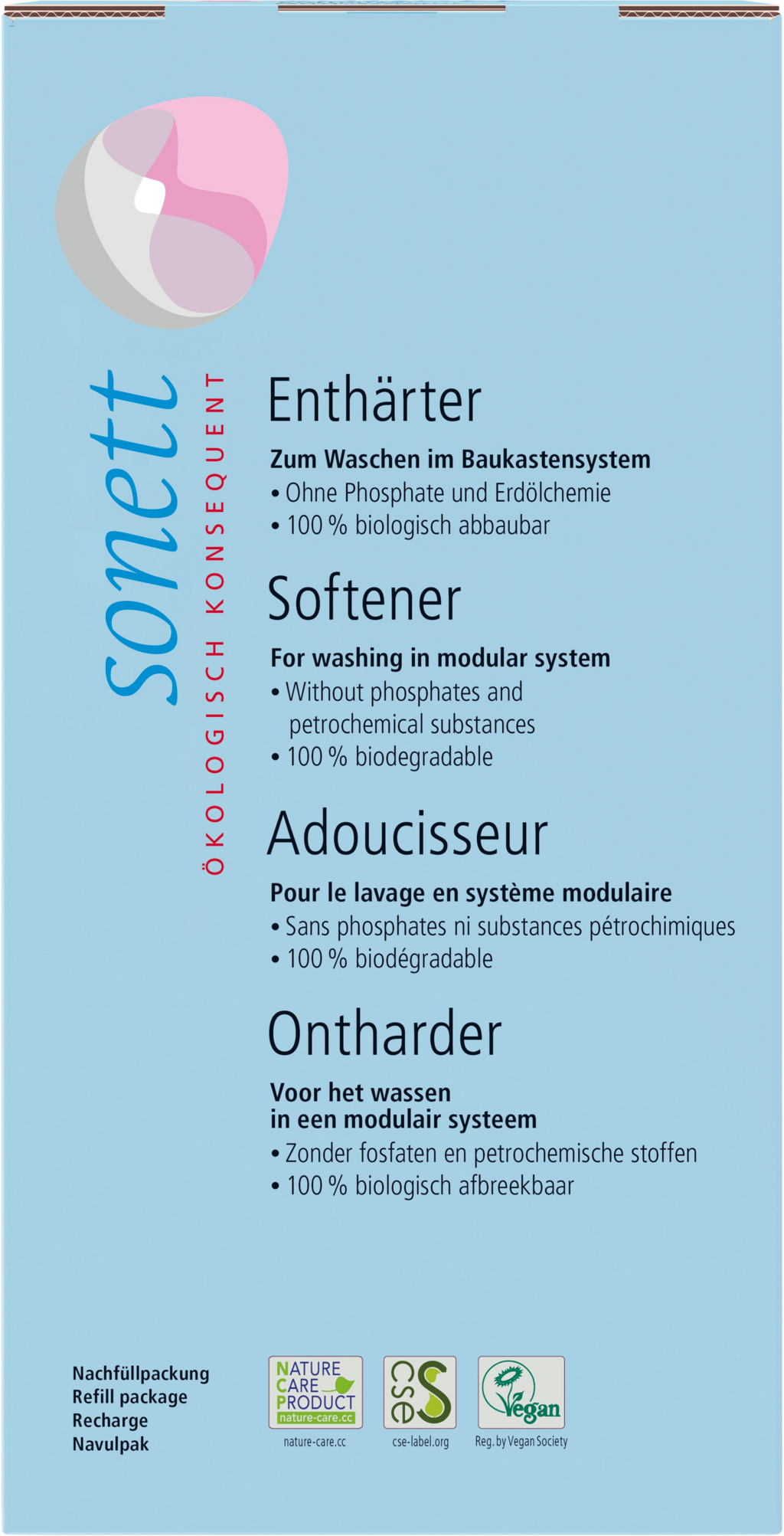 The main ingredient contained in the softener is zeolite. This silicate binds water-hardening calcium and magnesium ions thus softening the water. Soda and citric acid bind the limescale so that the detergent used can develop its full washing power.